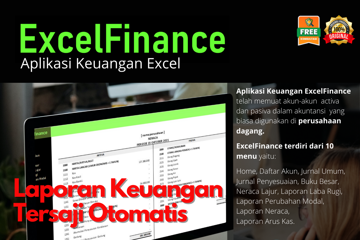 Aplikasi Keuangan ExcelFinance merupakan aplikasi laporan keuangan berbasis Ms. Excel. Aplikasi ini ada 2 macam, untuk perusahaan dagang dan untuk perusahaan jasa. Secara umum sebenarnya isinya sama, bedanya ada di akun-akun terkait pendapatan usaha dan persediaan barang.